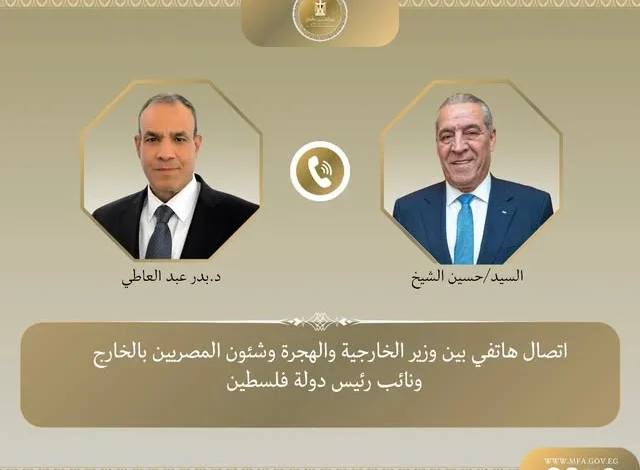 جرى اتصال هاتفي يوم السبت، 15 نوفمبر 2025، بين د. بدر عبد العاطي وزير الخارجية والهجرة وشؤون المصريين بالخارج وحسين الشيخ نائب رئيس دولة فلسطين. يأتي هذا الاتصال في إطار التنسيق المستمر بين الجانبين حول تطورات الأوضاع في فلسطين وجهود تعزيز اتفاق شرم الشيخ للسلام وضمان تنفيذه.