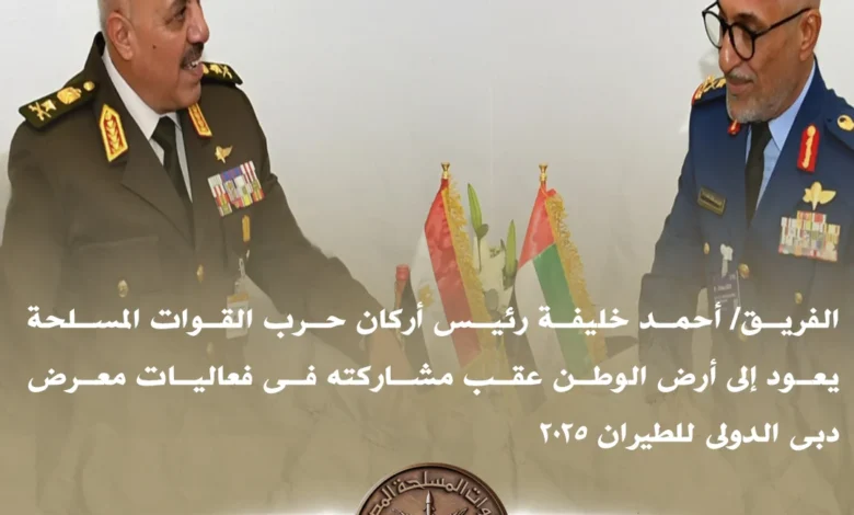 عاد الفريق / أحمد خليفة، رئيس أركان حرب القوات المسلحة، إلى أرض الوطن بعد انتهاء زيارته الرسمية لدولة الإمارات العربية المتحدة، حيث حضر فعاليات معرض ‘دبي الدولي للطيران 2025’. وتمثلت الزيارة في وفد عسكري رفيع المستوى، شمل قائد قوات الدفاع الجوي وقائد القوات الجوية وعدد من القادة والضباط من القوات المسلحة.